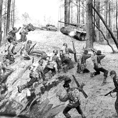 Painting of “The 442nd Rescue of the Lost Battalion in Vosges, France” by Charles McBarrow.